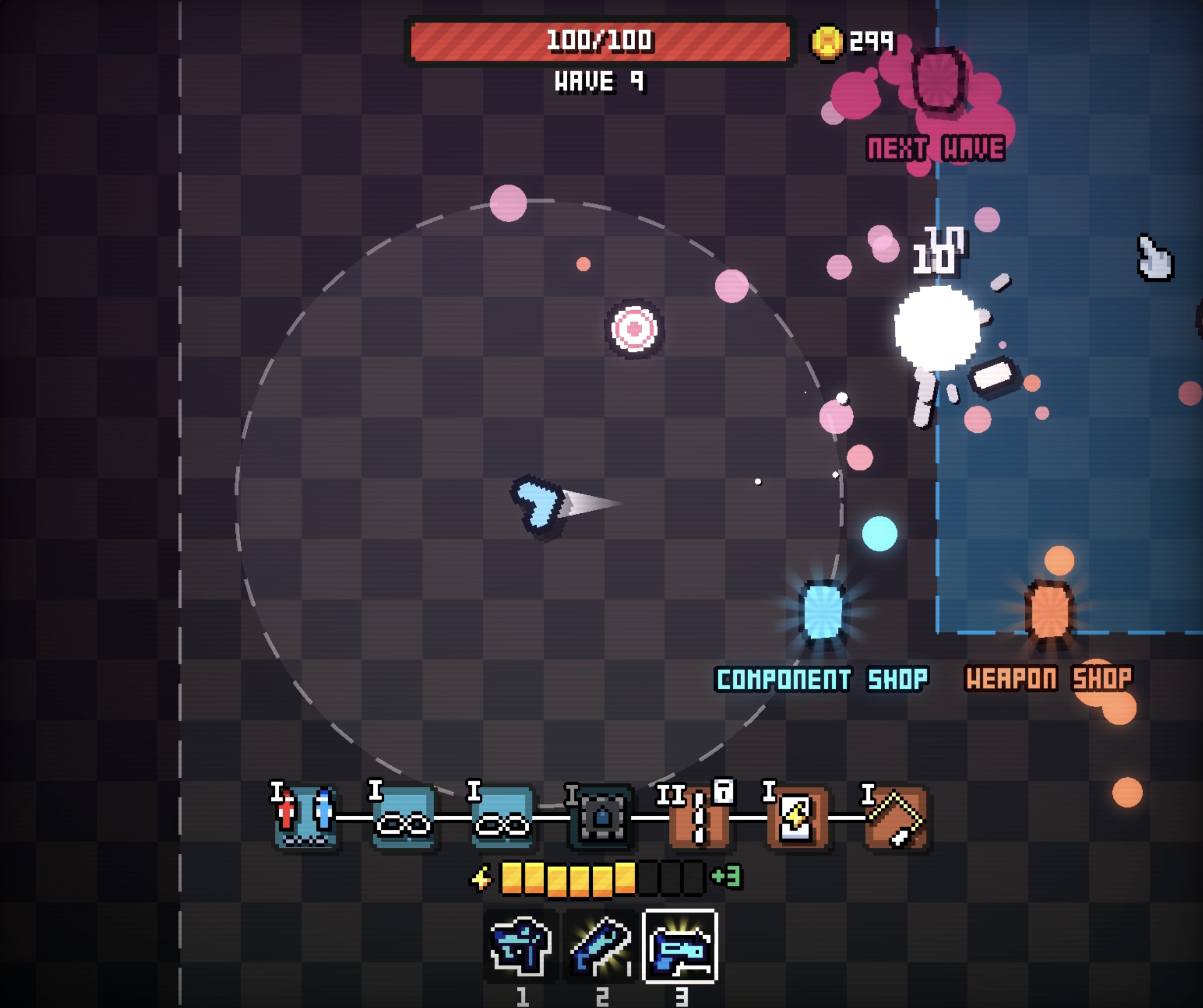 Once you finish your first wave, you'll unlock the shop with lots of components. Buy what you like and place them in your weapon.