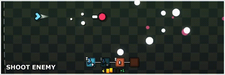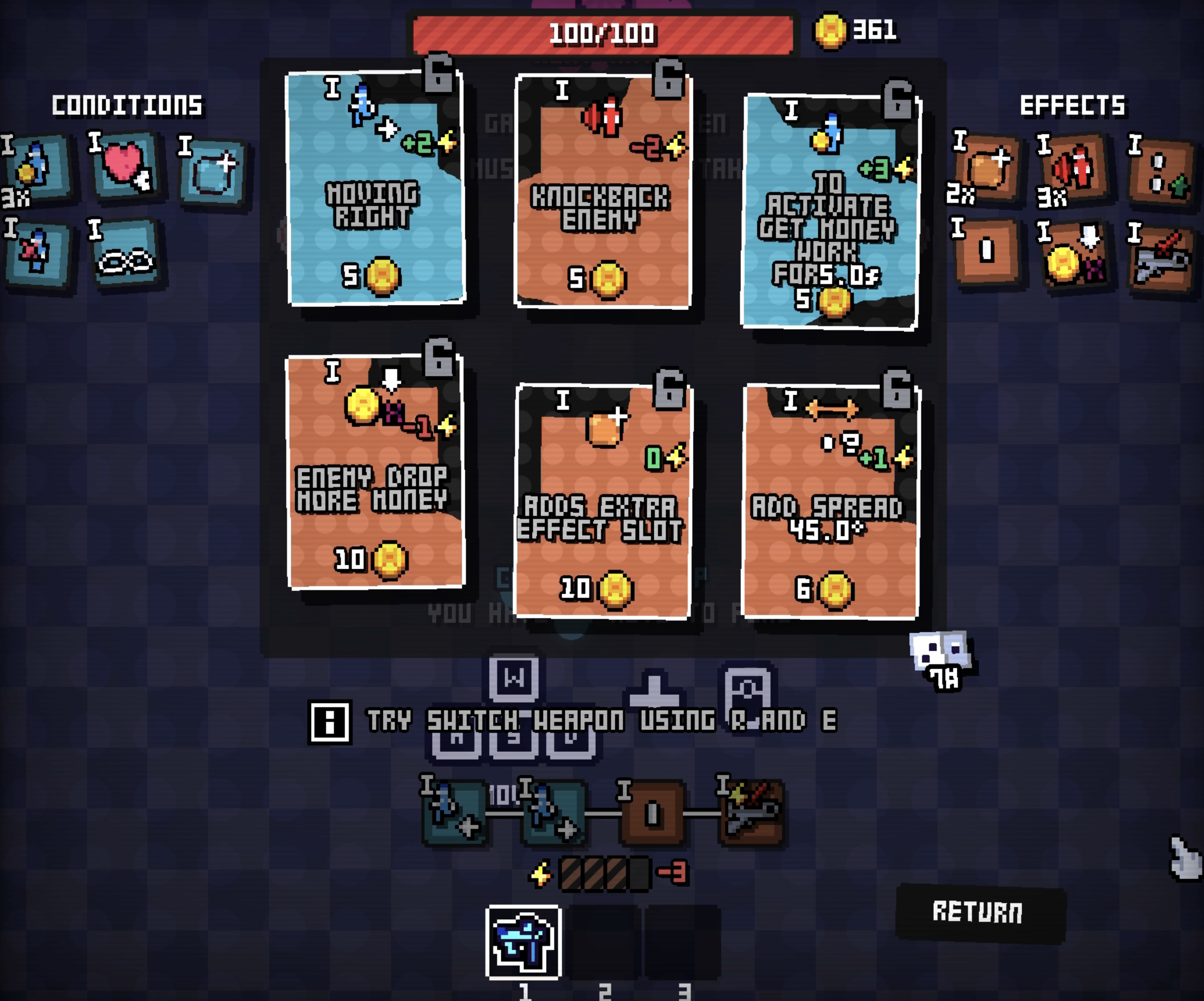 While making this game, I was thinking about Noita's system and how it creates such complex wands from simple elements. At first, my approach was to make complex schemes for weapons—in early builds there were combinations of logical elements like AND/OR, chains of blocks, etc. This idea was declined after the very first playtest; such a system needs to be the core idea with all gameplay revolving around it, so it wasn't fitting for this game. However, the weapon slot system and the fact that you can equip 3 weapons were inherited from this idea.