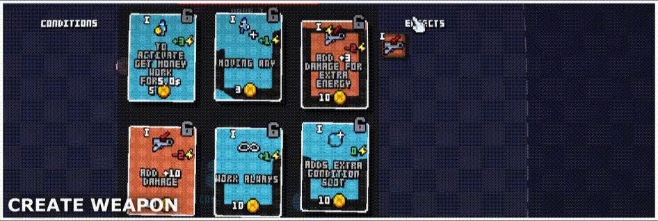 Mix and match conditions and effects to create wild, unpredictable weapon combinations. The harder the condition to satisfy, the more Energy you earn to spend on devastating effects!