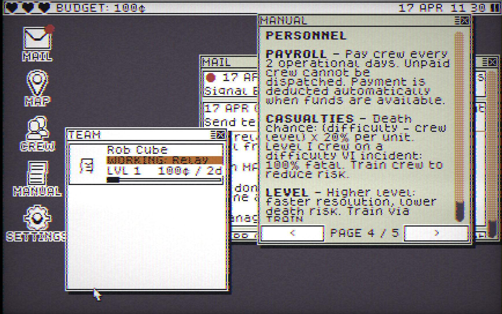 Incidents have difficulty and danger ratings. Send underqualified crew and they'll still fix it — just slower. Higher danger means higher pay, and higher chance the signal comes back but your people don't.